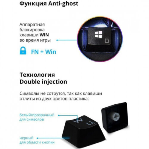 | Дополнительная информация | регулируемая подсветка символов и клавиш, технология Double injection, функция anti-ghost, ресурс до 10 миллионов нажатий, аппаратная блокировка клавиши WIN во время игры |