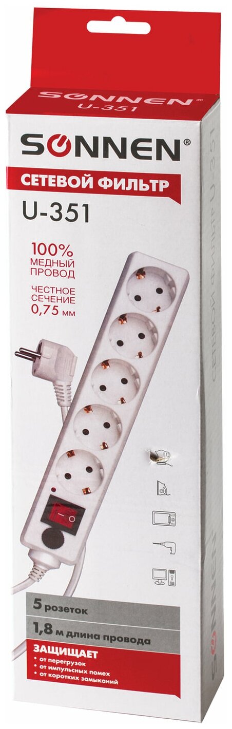 Сетевой фильтр SONNEN U-351, 5 розеток, с заземлением, выключатель, защита от перегрузок, 10 А, 1,8 м, 511424