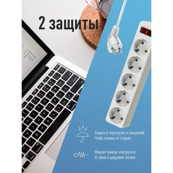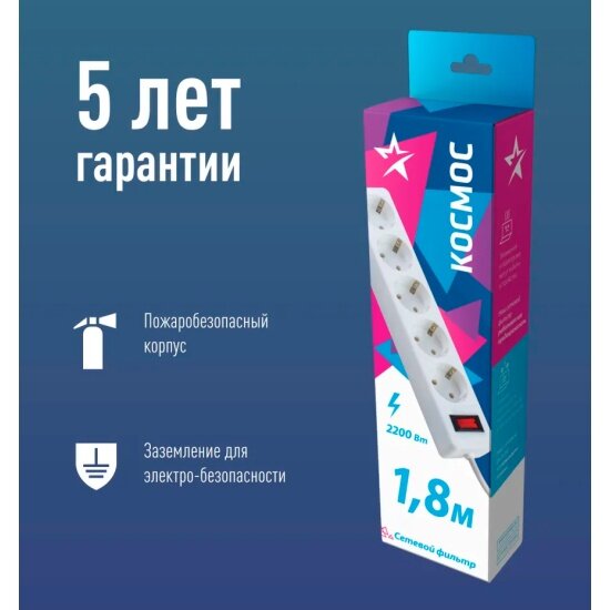 Сетевой фильтр космос FKsm1.8m-5g(W), 5 розеток, с/з, 10А / 2200 Вт белый 1.8 м 0.75 м² 5