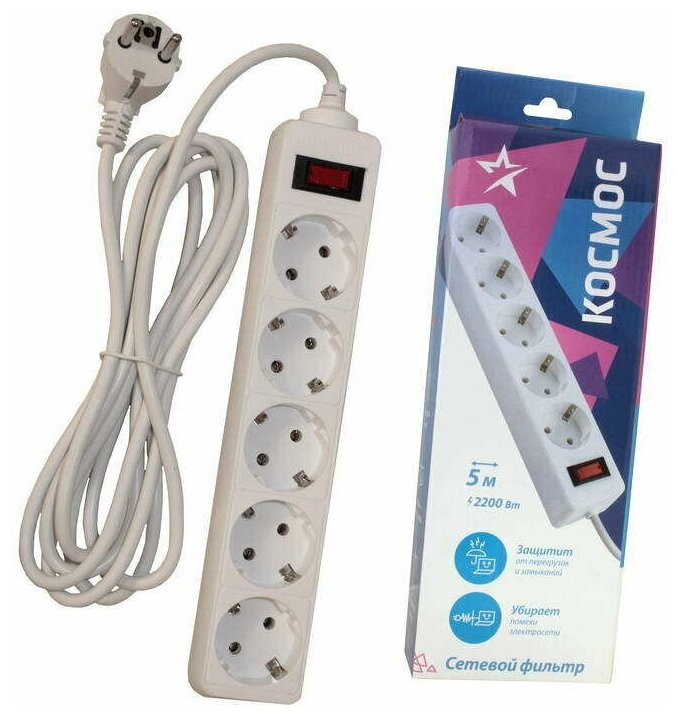 Сетевой фильтр космос FKsm5m-5g(W), 5 розеток, с/з, 10А / 2200 Вт белый 5 м 0.75 м² 5