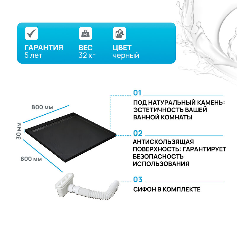 Душевой поддон из искусственного камня WeltWasser WW TRS 80 STONE-BL 80x80 10000004378 Черный информация: