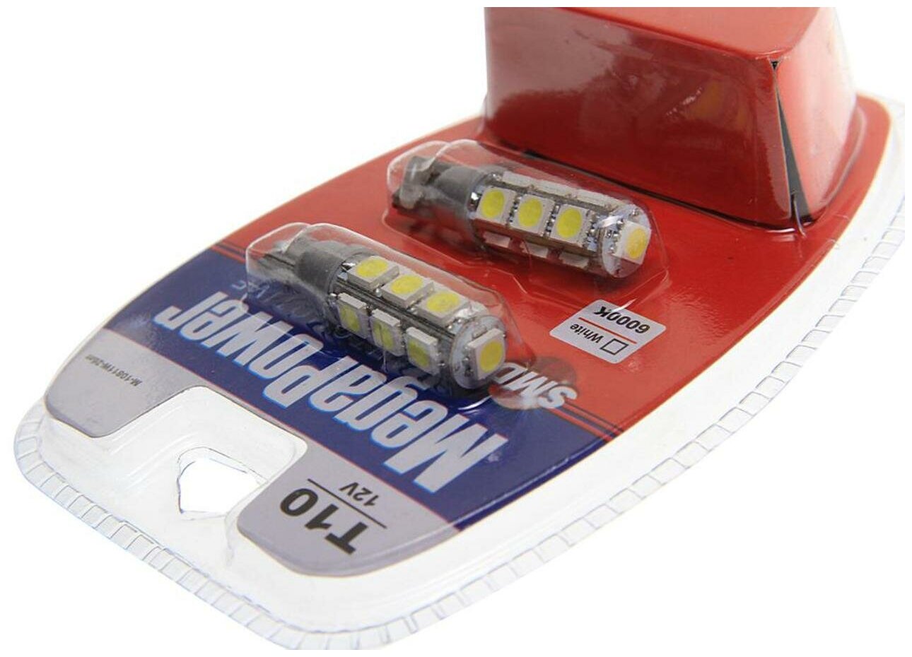 Отзывы на Лампа светодиодная 12V W5W T10W W2.1x9.5d 6000K бесцокольная 13 LED блистер (2шт.) с тест. MEGAPOWER 10811W-2блт