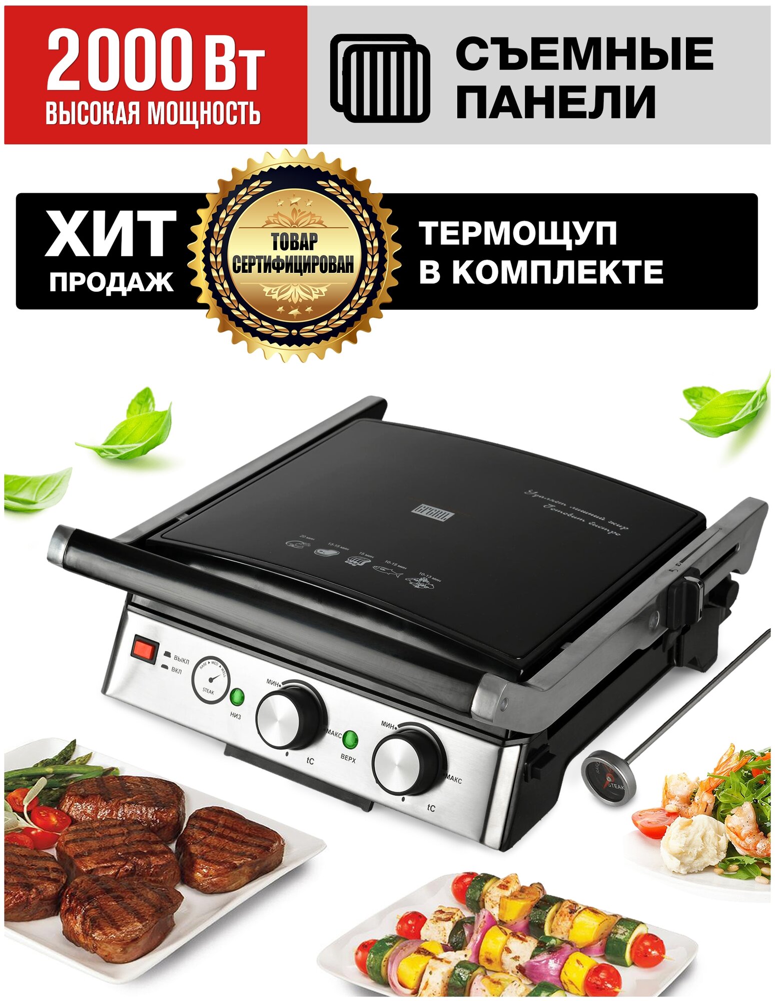Многофункциональный электрический гриль GFGRIL GF-165, термощуп, гриль мощностью 2000 Вт, функция панини, регулировка наклона / GFGRIL GF-165 электрогриль со съемными панелями информация:
