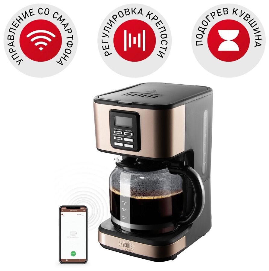 | Плюсы: | Управление с помощью приложения на телефоне, регулировка крепости напитка, подогрев кувшина, большой объём кувшина для кофе, автоматическое отключение, отсрочка старта |