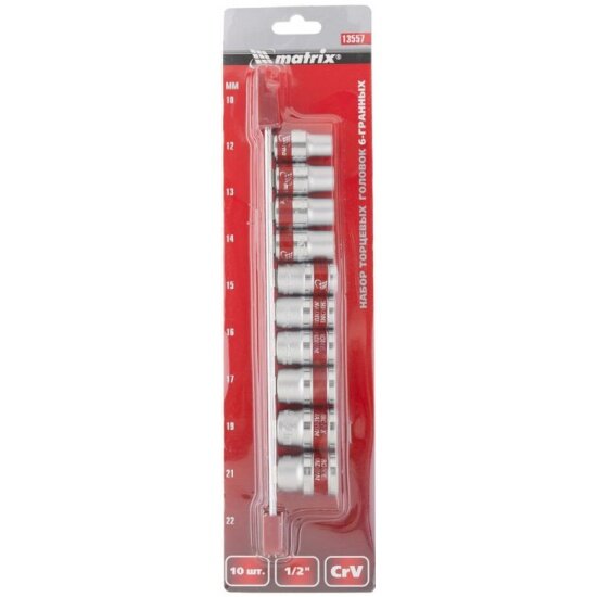 10 цен на Набор торцевых головок MATRIX 13557, 1/2", 6-ти гранные, CrV, 10шт., 10-22мм