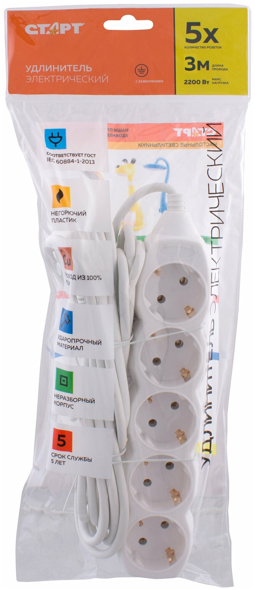 Удлинитель СТАРТ S 5x5-Z, 5 розеток, 5 м, с/з, 10А / 2200 Вт