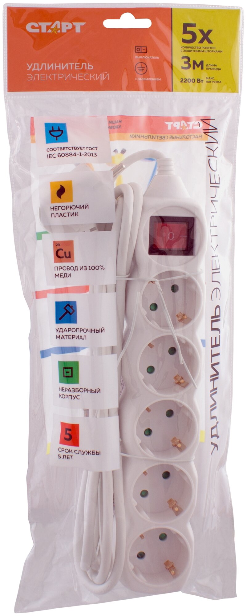 Удлинитель СТАРТ S 5x5-Z, 5 розеток, 5 м, с/з, 10А / 2200 Вт