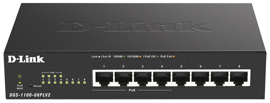 Коммутатор D-Link DGS-1100-08PLV2/A1A, EasySmart managed switch with 8 10/100/1000Base-T ports (4 ports with PoE 802.3at support (80W Total).4K Mac address, 802.3x Flow Control, Port Trunking, Port Mirroring, I 8 566 ₽