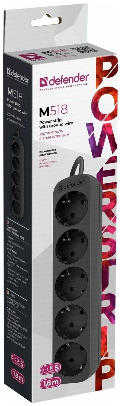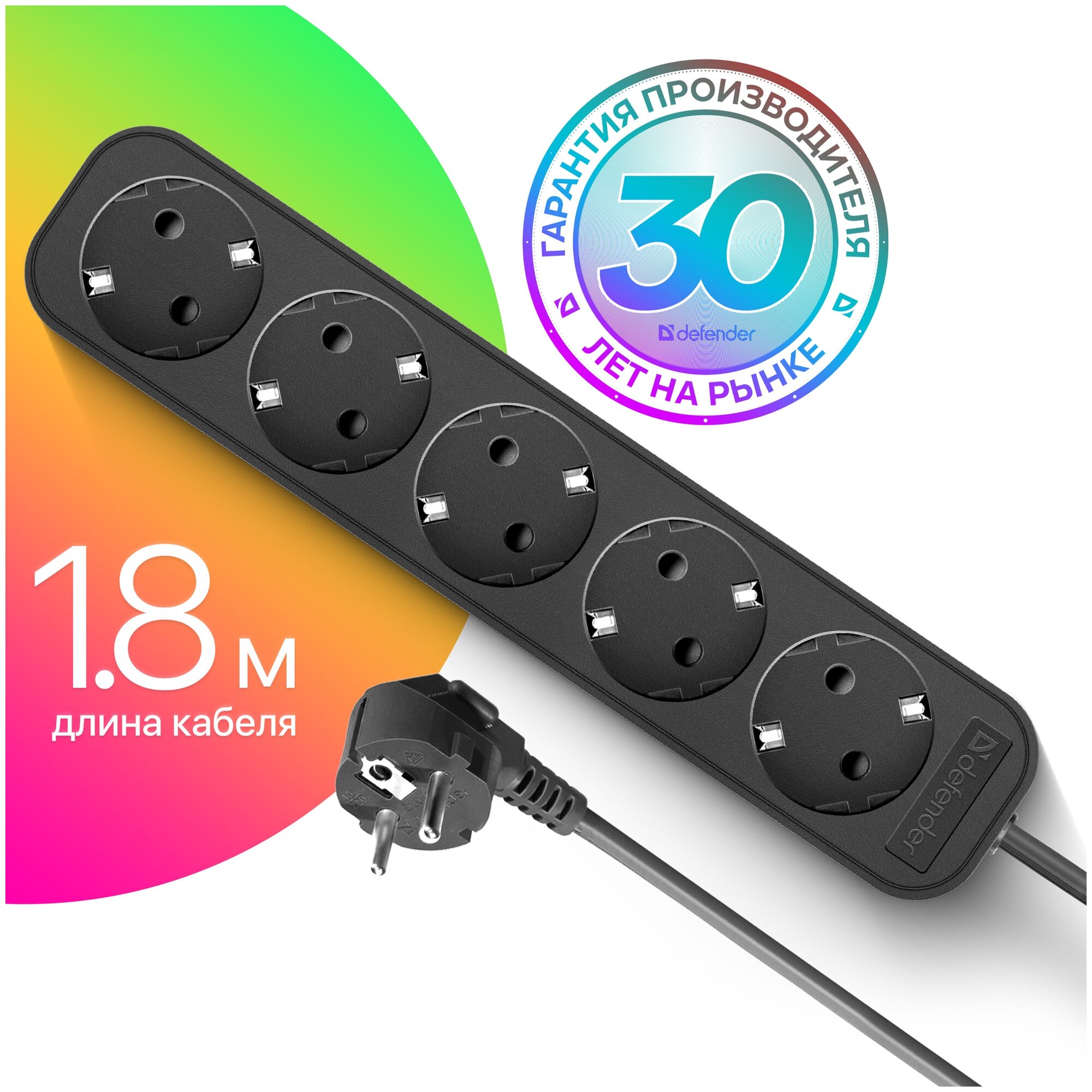 Удлинитель с заземлением Defender M518 1.8 м, 5 розеток, черный