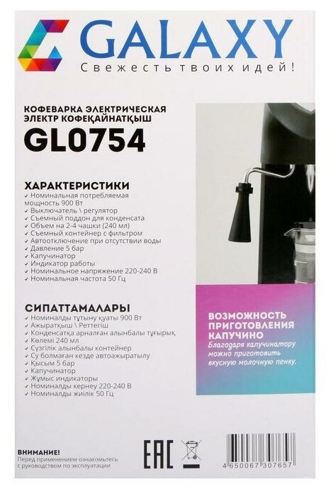 Кофеварка электрическая GALAXY LINE GL 0754, черная, 5 бар, 900 Вт, 240 мл, выключатель\регулятор, съемный поддон для конденсата, съемный контейнер с фильтром, капучинатор, индикатор работы