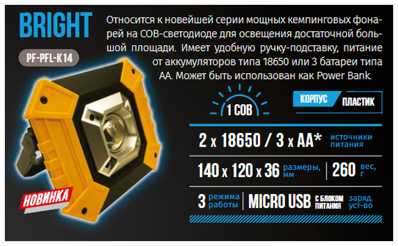 PF-PFL-K14 Фонарь кемпинговый "сибирский следопыт-bright", 1 COB, Power Bank, аккум. 220В, USB