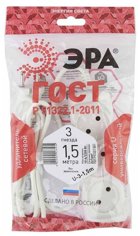 Удлинитель ЭРА U-3-1 5m без заземления 3 розетки 1 5 м 10А