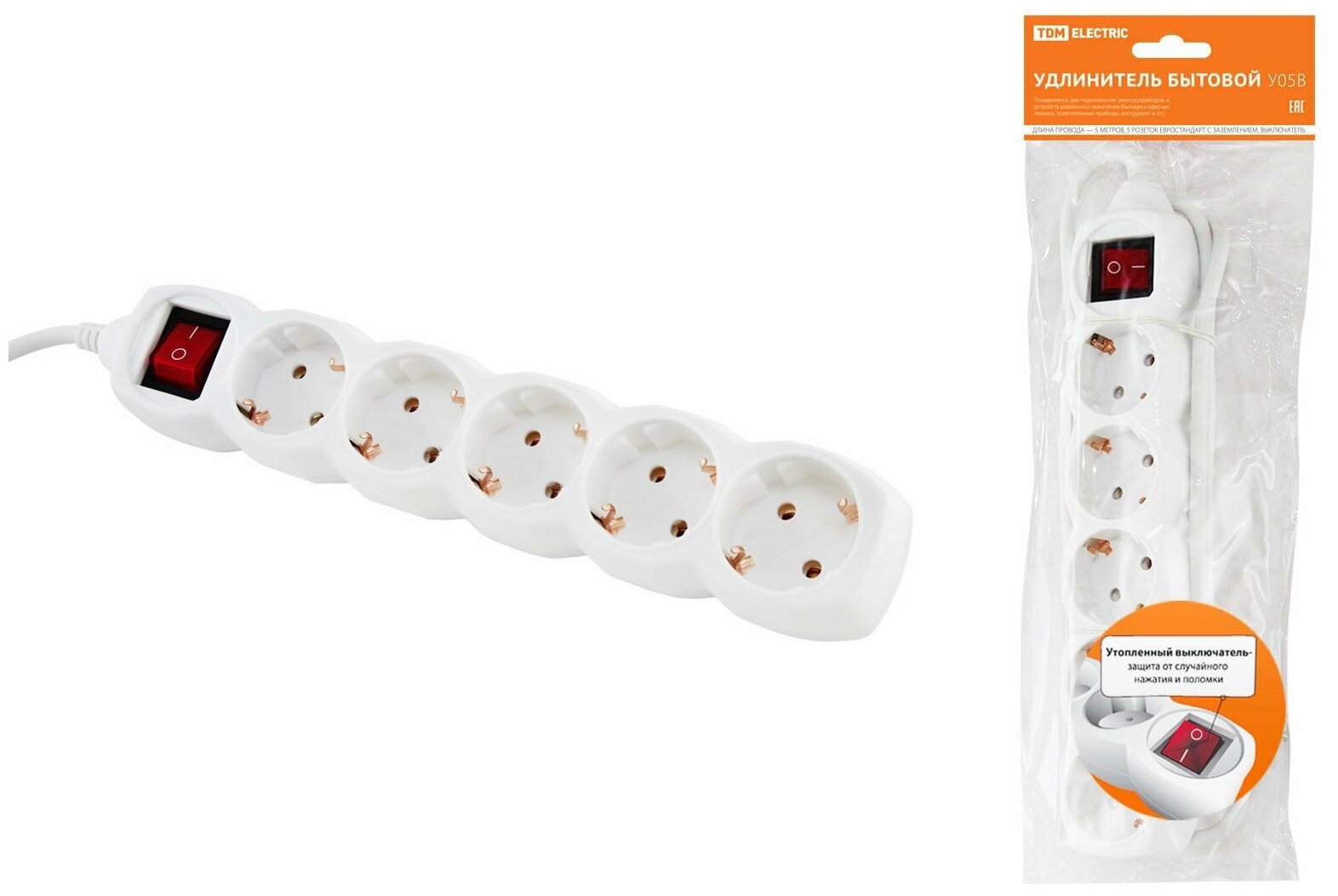 TDM ЕLECTRIC Удлинитель бытовой "Люкс" УЛ05В выкл, 5 гнезд, 5м, с/з, с з/ш, ПВС 3х1мм2 16А/250В бело-серый TDM