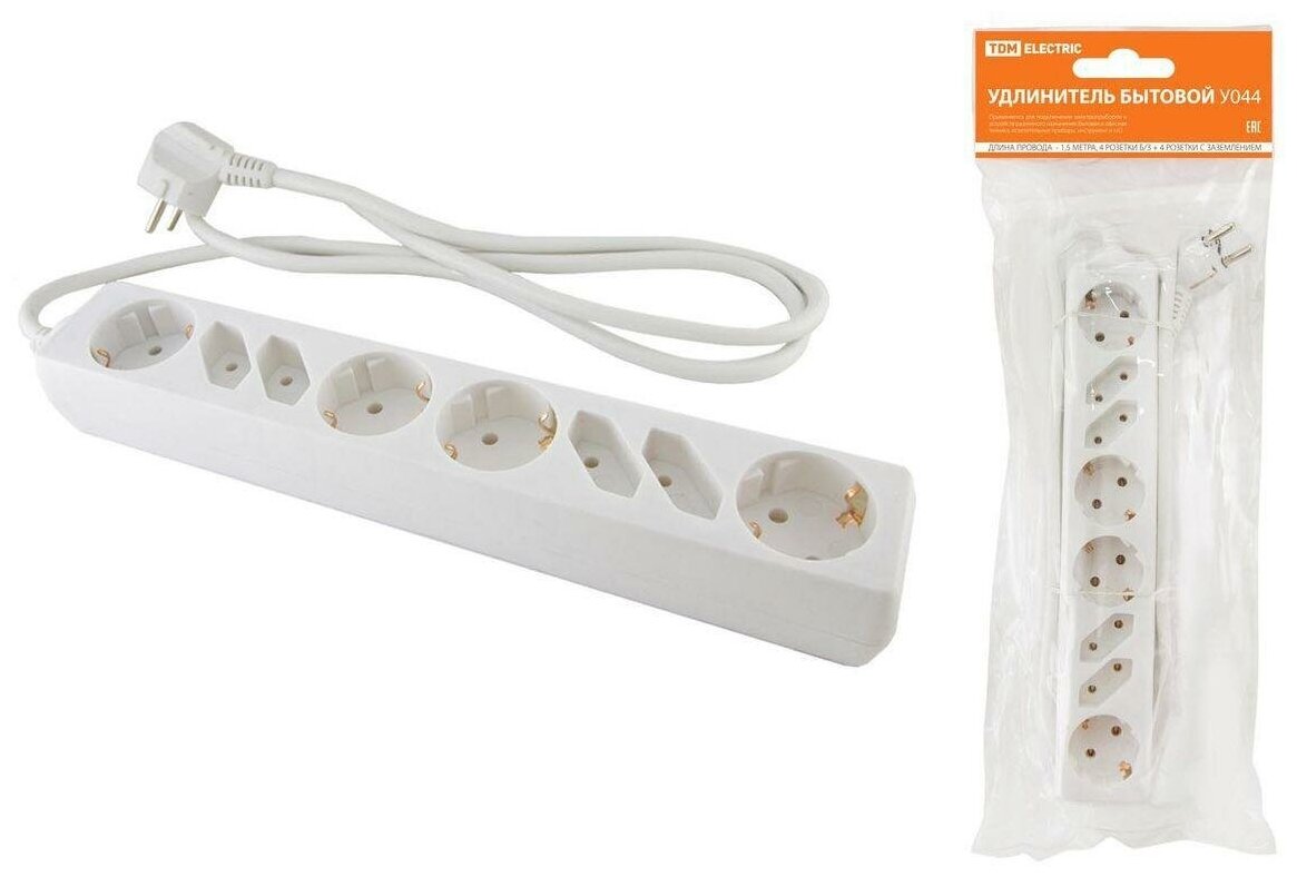 Удлинитель бытовой У044, 4 б/з+4 с/з, 1,5метра, ПВС 3х1,5мм2 16А/250В TDM SQ1303-0310 (1 шт.)