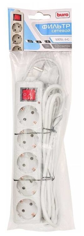 Buro Сетевой фильтр, 5 розеток, 3 метра, 500SL-3-G , серый пакет ПЭ