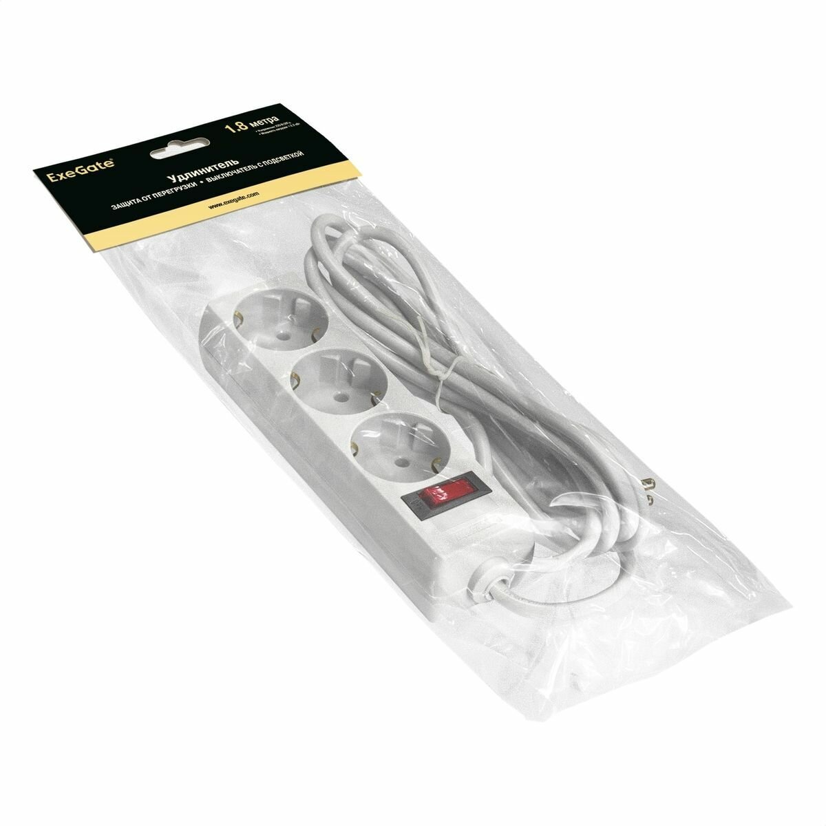 Удлинитель ExeGate EC-3-1.8W (3 евророзетки с заземлением, 1.8м, защита от перегрузки, выключатель с подсветкой, белый) EX279346RUS