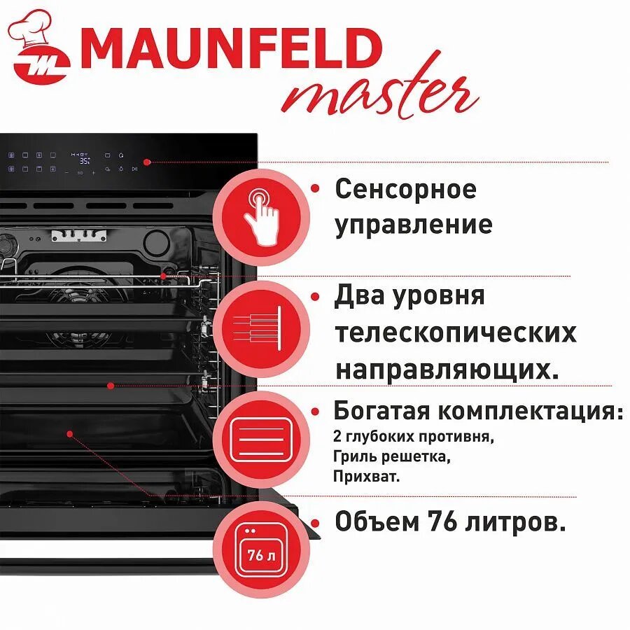 Шкаф духовой электрический MAUNFELD AEOC6040B2, объем 60 литров, 3 стекла, утапливаемые переключатели