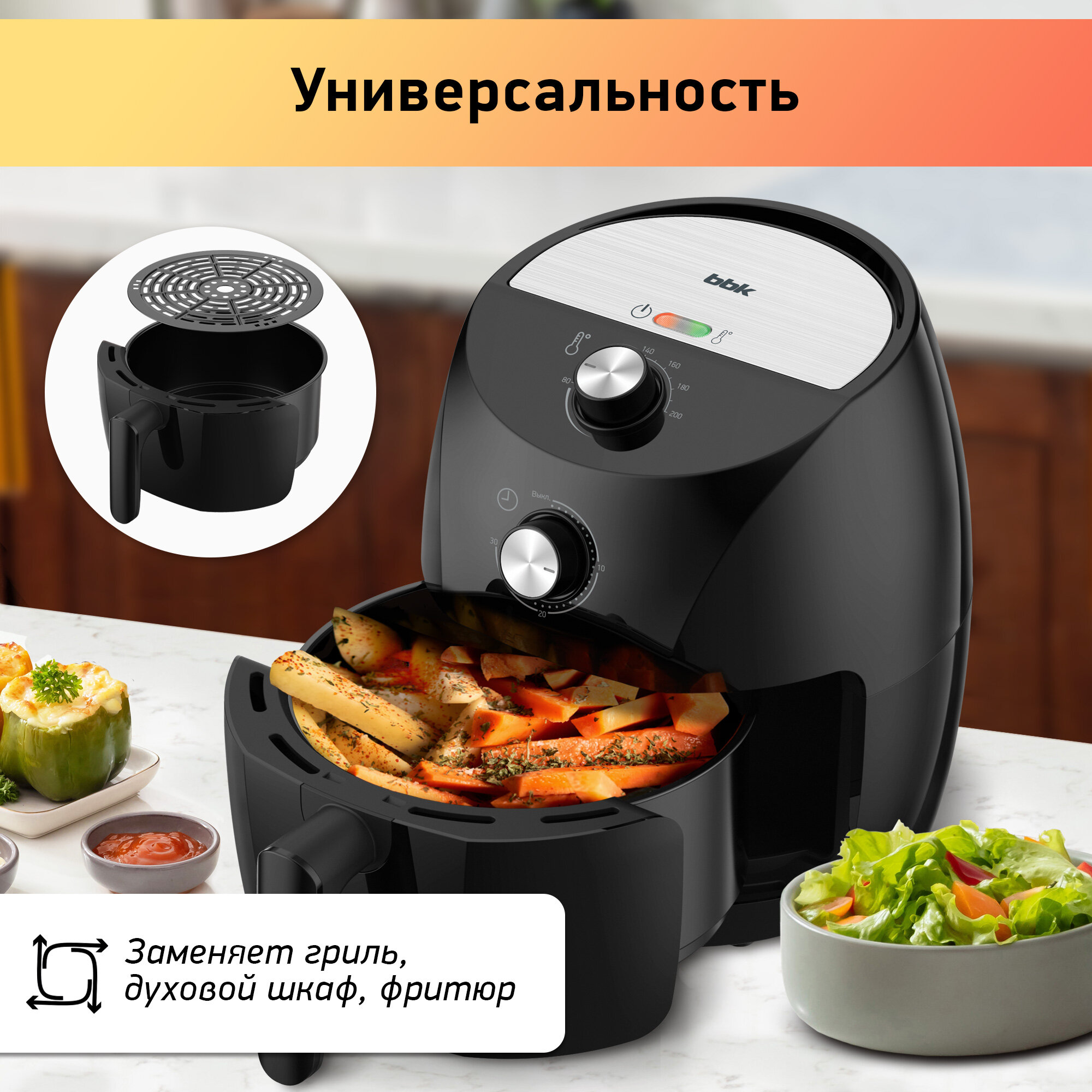 10 цен на Аэрогриль с антипригарным покрытием BBK AF323M черный, объем чаши 3,2 л, мощность 1400 Вт