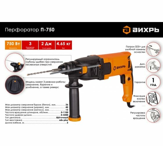 | Комплектация | Перфоратор Вихрь П-750, инструкция, упаковка |