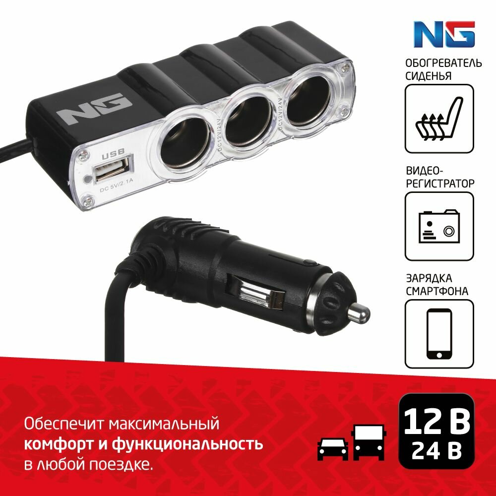 NG Разветвитель прикуривателя, 3 выхода +1 USB, 60 W, 2.1А, 12/24В, пластик