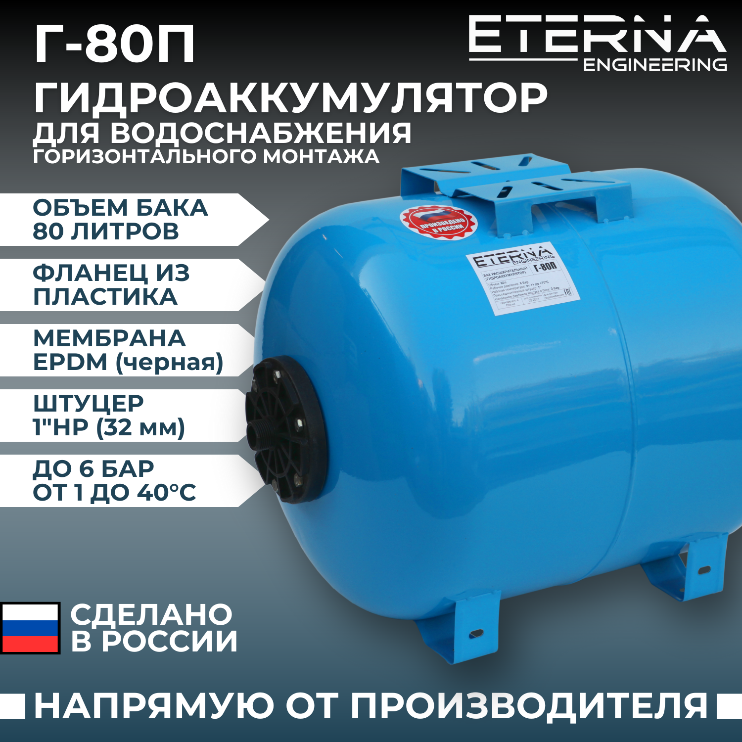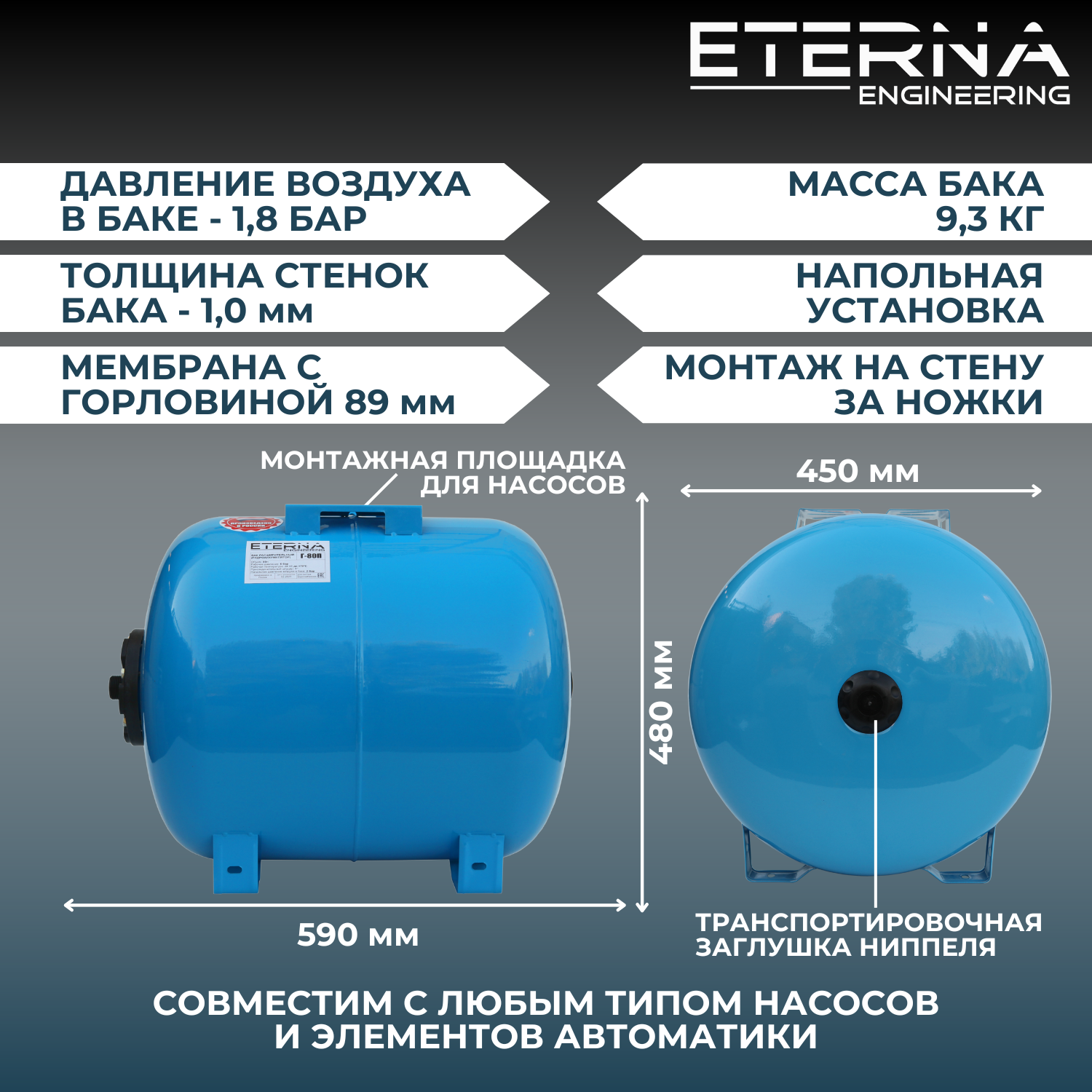 ETERNA Гидроаккумулятор ETERNA Г-80П, для систем водоснабжения, горизонтальный, 80 л информация: