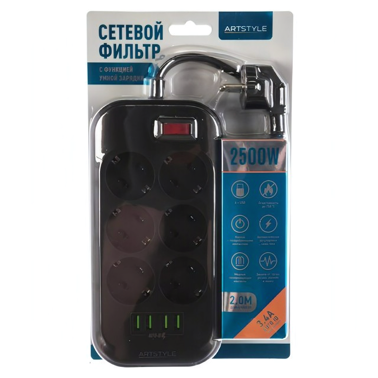 сетевой фильтр ARTSTYLE 6 гнезд 4USB 2м черный