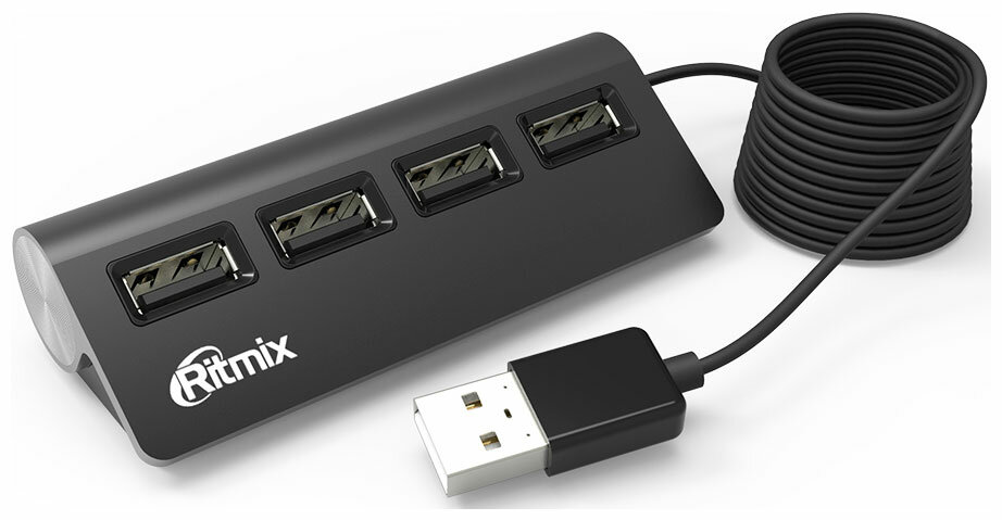 USB-HUB RITMIX CR-2400, черный, USB 2.0, 4 порта. Подключение к компьютеру/ноутбуку, питание по USB. Высокая скорость передачи данных до 480 Мбит/с. Прочный алюминиевый корпус.. Нескользящее основание. Встроенный кабель длиной один метр. USB-штекер с держ