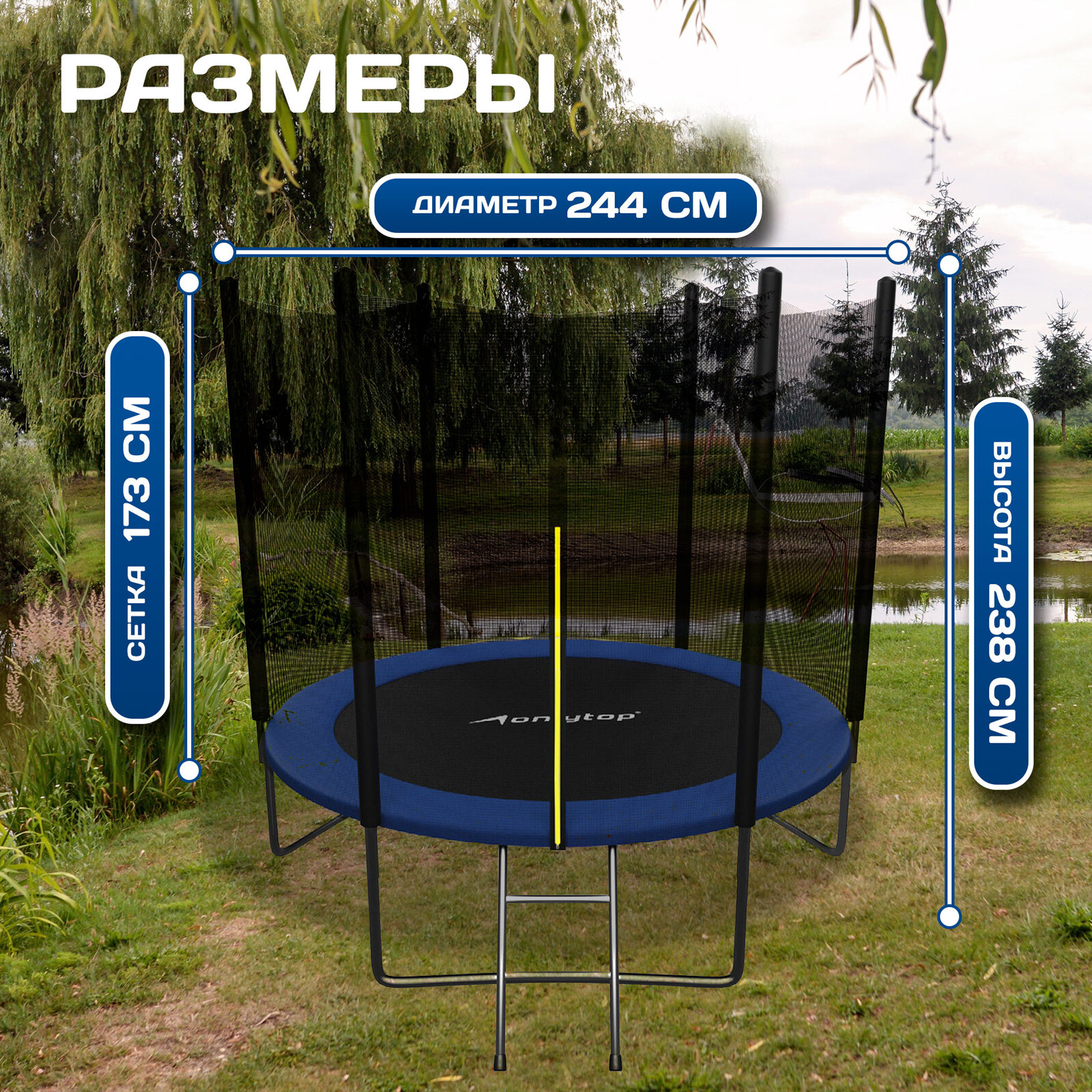 Батут ONLITOP, диаметр 244 см, с внешней защитной сеткой (173 см) и лестницей, максимально допустимый вес 150 кг, цвет синий информация:
