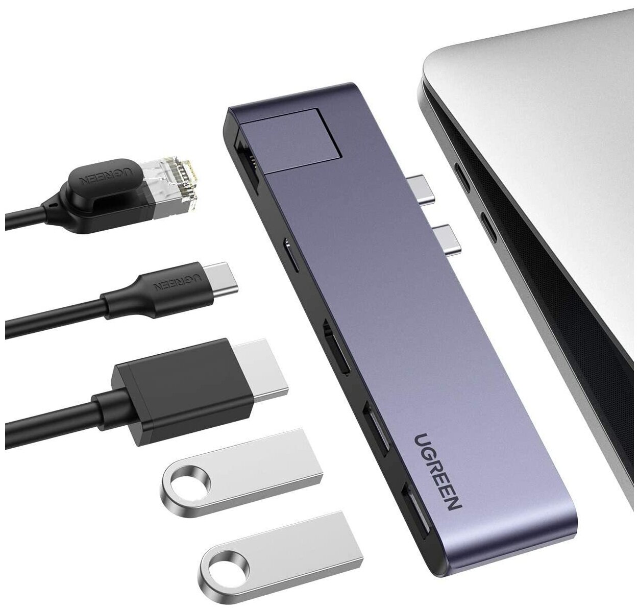 10 цен на UGREEN. USB концентратор для MacBook (хаб), 2 x USB 3.0, HDMI, RJ45, Thunder Bolt 3 (50984)