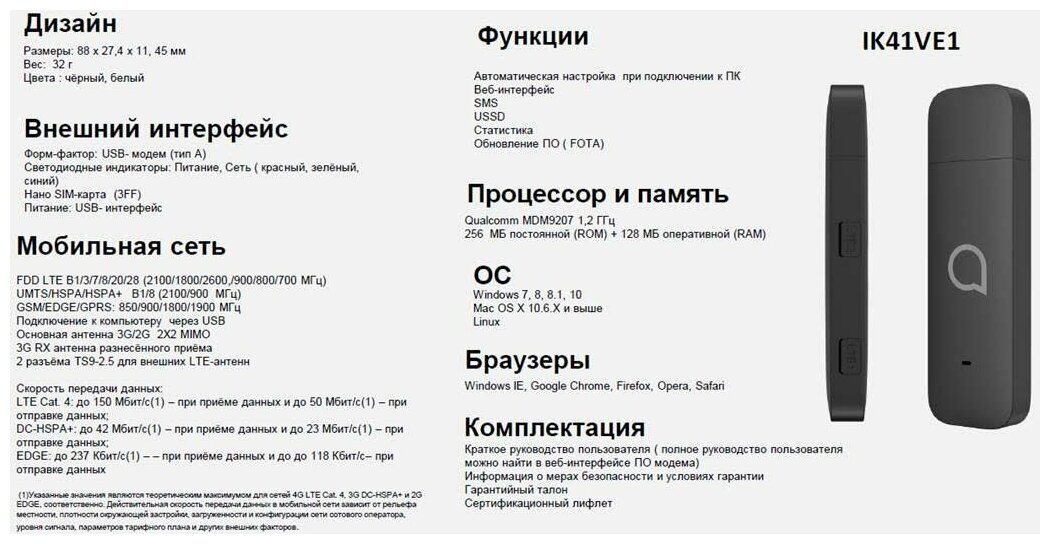 Модем USB Alcatel IK41VE1 2G/3G/4G универсальный, черный информация: