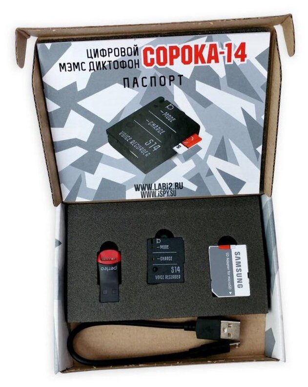 Диктофон с активацией голосом VOX - Сорока 14.3 (VOX, циклическая запись, карта 32Гб, запись до 5.3 суток) - диктофоны цифровые в подарочной упаковке