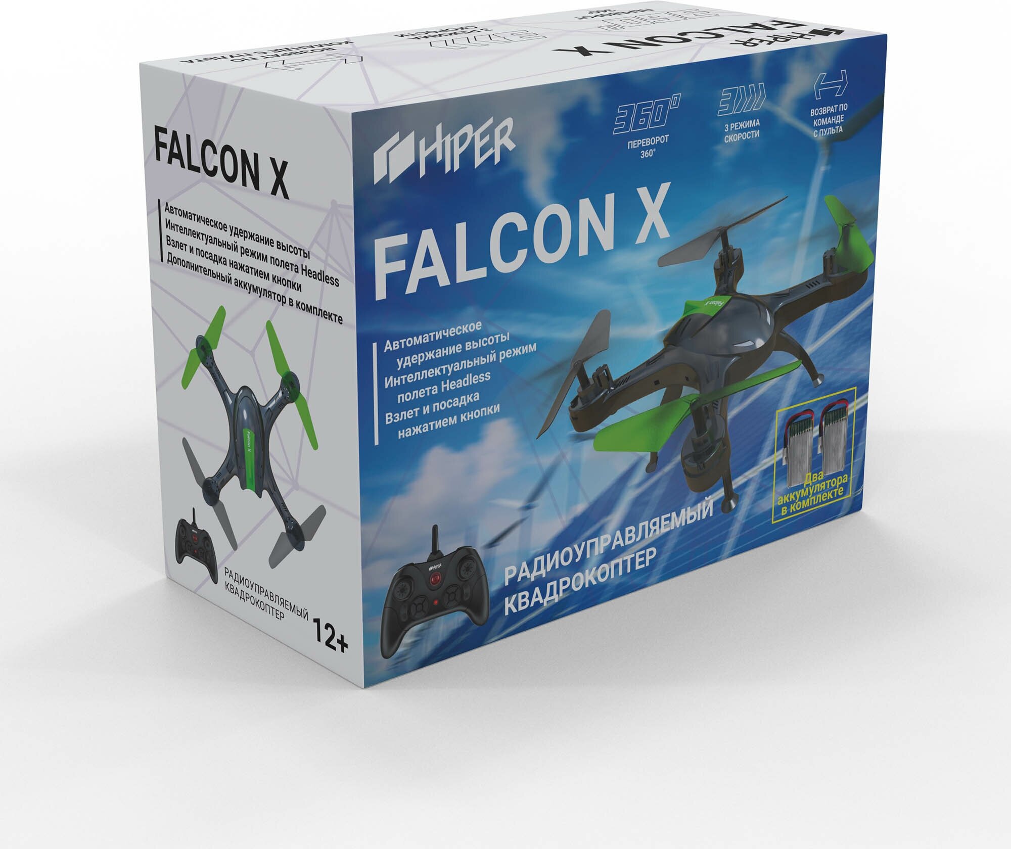 Радиоуправляемый квадрокоптер HIPER HQT-0002 FALCON X, два аккумулятора, автоматическое удержание высоты, система стабилизации, 3 режима скорости, кульбиты, режим headless, черный/зеленый