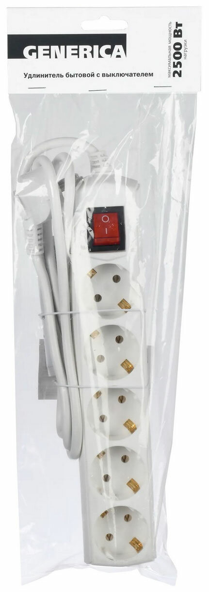 Удлинитель с выключателем Generica У05В, ПВС 3 x 1 мм², с заземлением, 5 розеток, 1,5 м, белый