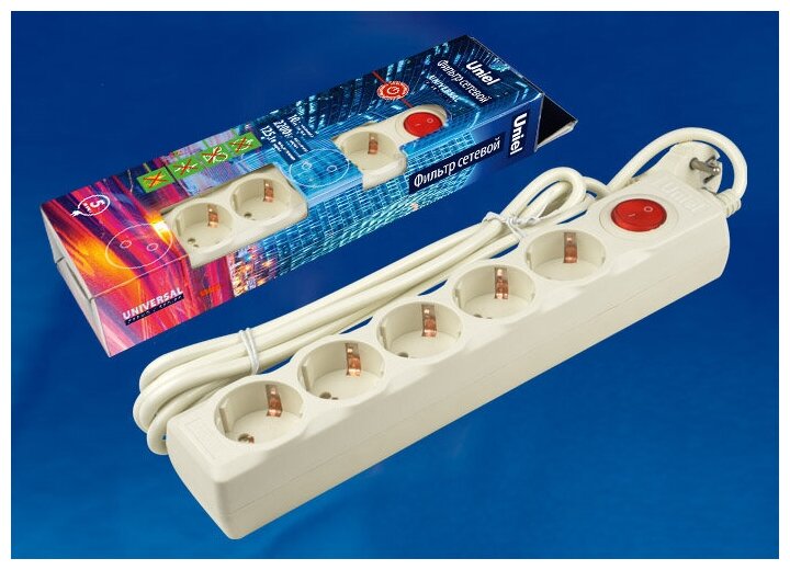 Uniel S-GSU5-5 IVORY Cетевой фильтр серии Universal, 5м (Пвс 3*0,75), 5 гнезд, с/з. 10А. Защита от перенапряжения, короткого замыкания. TM Uniel.