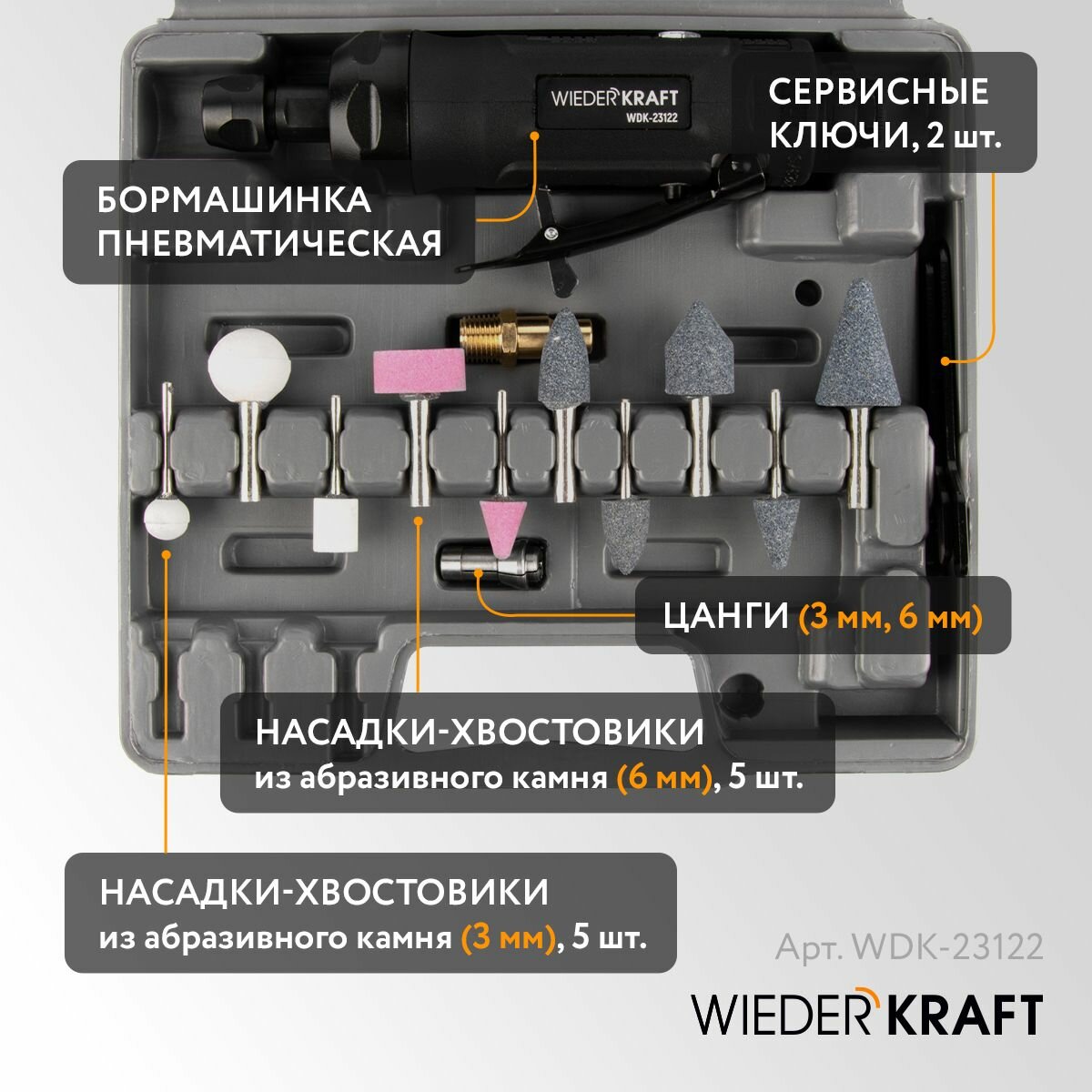 Бормашинка пневматическая WIEDERKRAFT WDK-23122, с набором насадок 10 шт. информация: