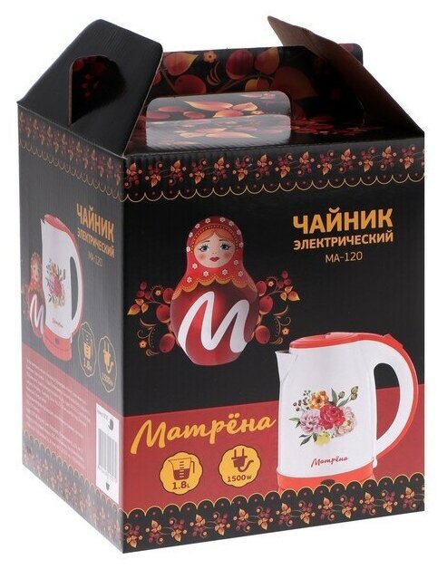 Чайник электрический Матрёна Ma-120, металл, 1.8 л, 1500 Вт, бело-зелёный с рисунком Матрёна 9196905