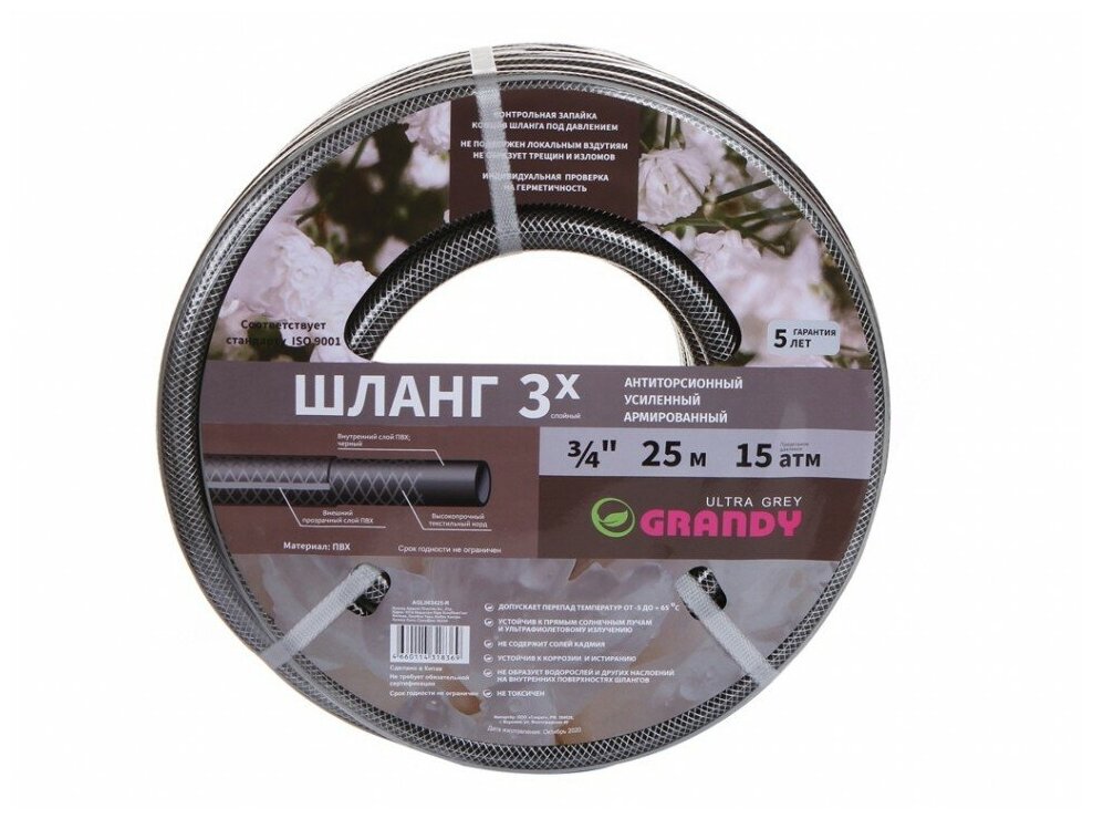 Шланг поливочный, 3/4 '', диаметр 20х25 м, 15 атм, армированный, 3 слоя, Grandy, Ultra Grey, ПВХ, AGL063425-R информация: