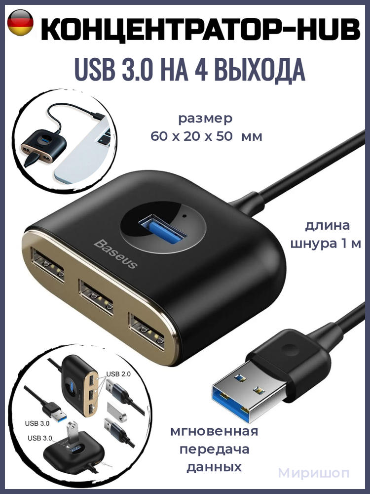 Отзывы на Хаб Baseus Square Round 4 in 1 USB3.0 to USB3.0+3xUSB2.0 - Черный (CAHUB-AY01)