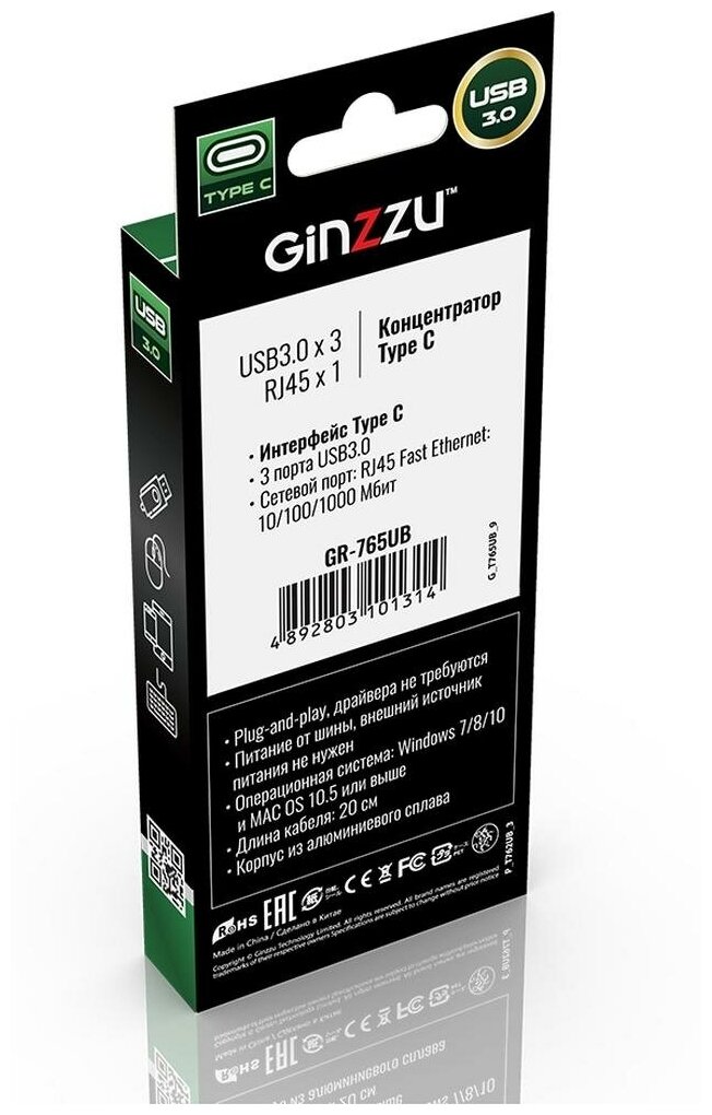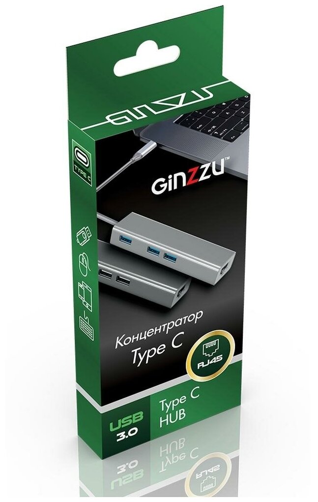 Хаб USB Ginzzu GR-765UB USB Type-C - 3xUSB 3.0/RJ45 Black 17