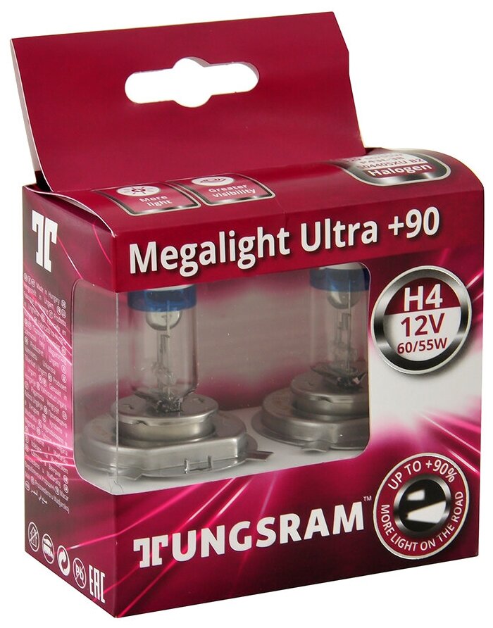 Лампы TUNGSRAM H4 +90%,Megalight Ultra 12V, 60/55W, P43t, 3200K, комплект 2 шт.+2 w5w информация: