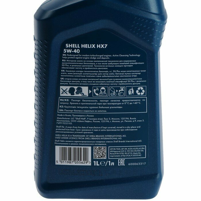 Синтетическое моторное масло SHELL Helix HX7 5W-40, 1 л, 1 кг, 1 шт 1 100 ₽