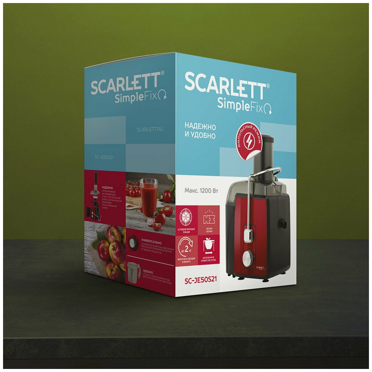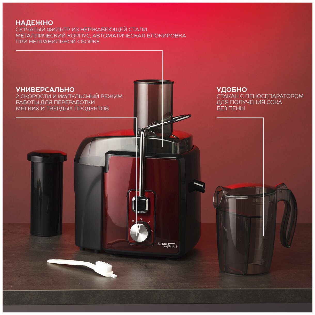 Соковыжималка центробежная электрическая Scarlett SC-JE50S21, красная 1200 Вт, Импульсный режим информация: