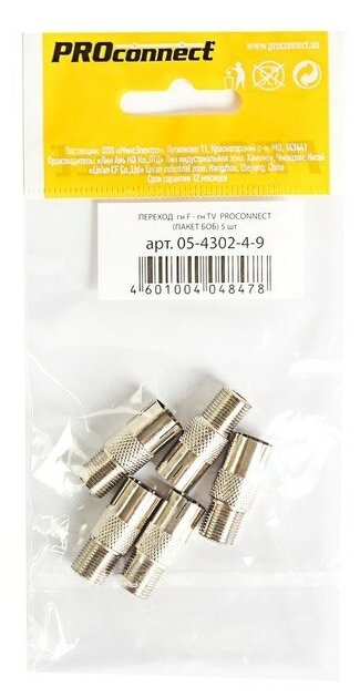 Отзывы на Переходник антенный RG-6, SAT, гнездо F - гнездо ТВ, 5шт PROconnect