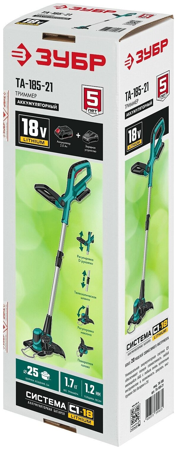 ЗУБР С1-18, 18 В, 25 см, 1 АКБ (2 Ач), аккумуляторный триммер (ТА-185-21)