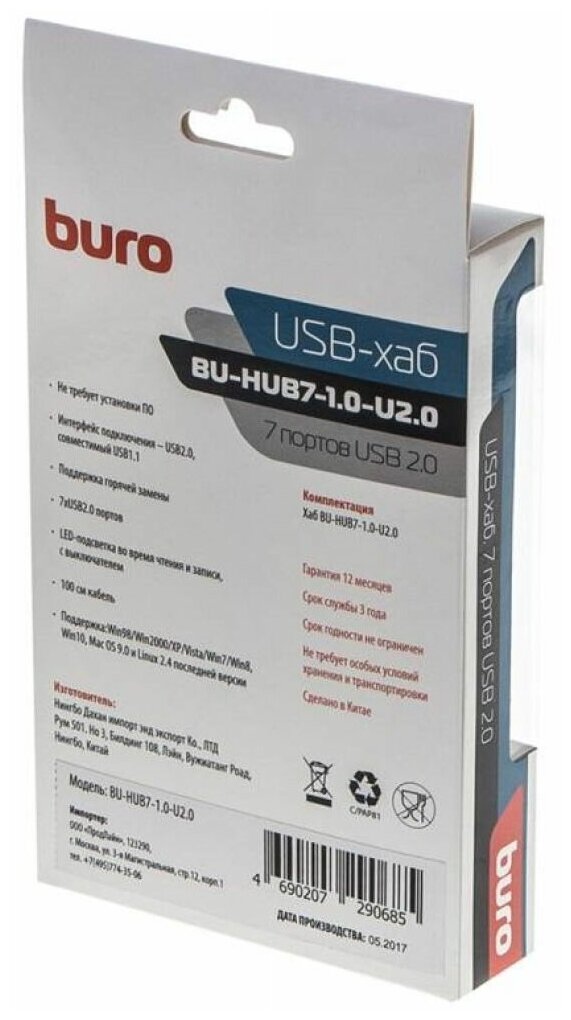 Концентратор USB 2.0 BURO BU-HUB7-1.0-U2.0 7 x USB 2.0 черный информация: