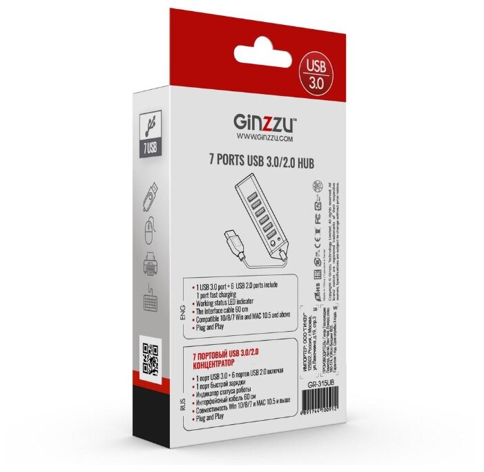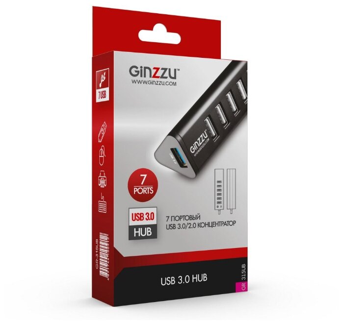 HUB GR-315UB Ginzzu USB 3.0/2.0, 7 port(1xUSB3.0+6xUSB2.0)