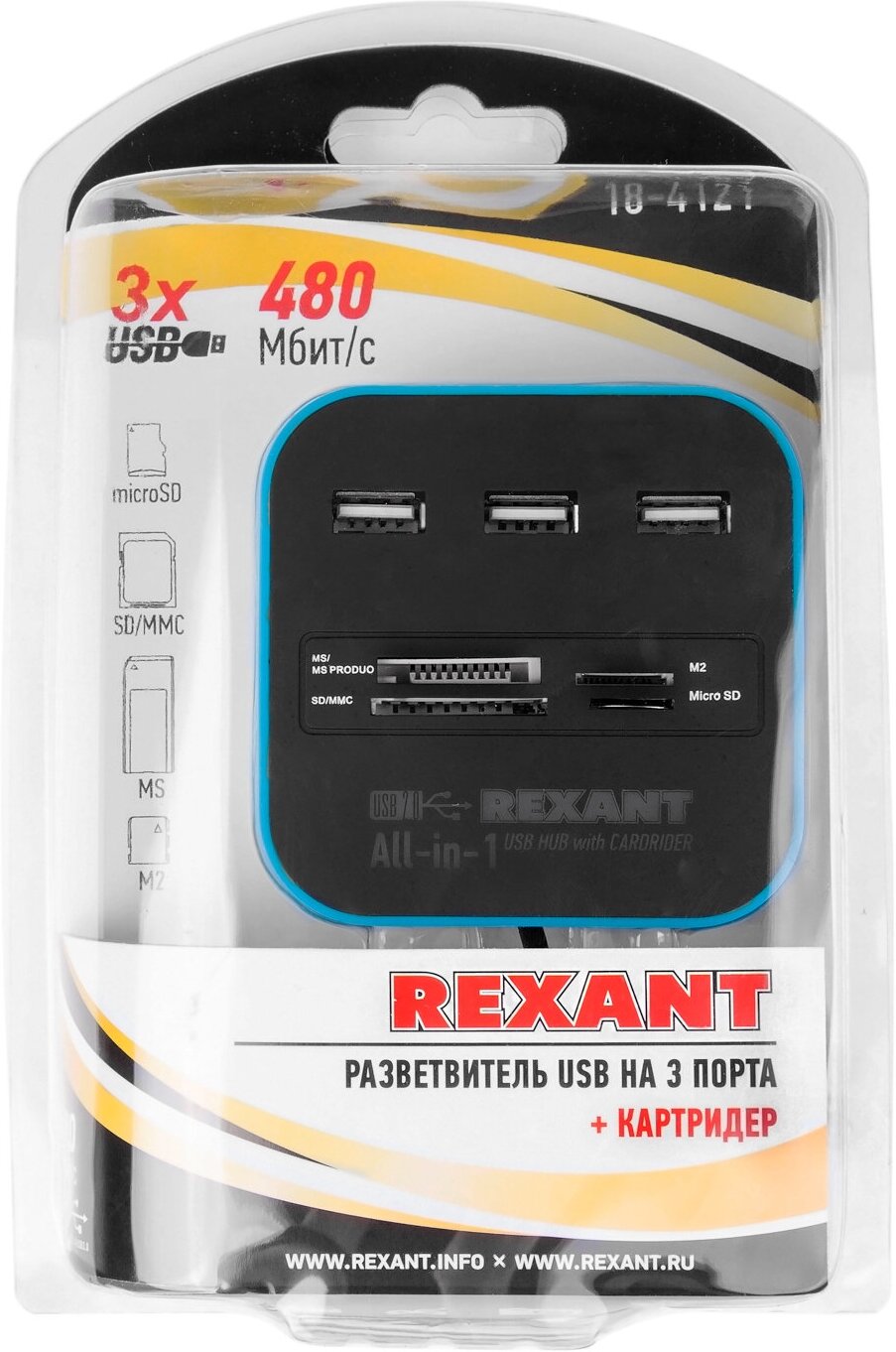 REXANT Разветвитель USB на 3 порта + картридер /Все в одном/ черный 18-4121