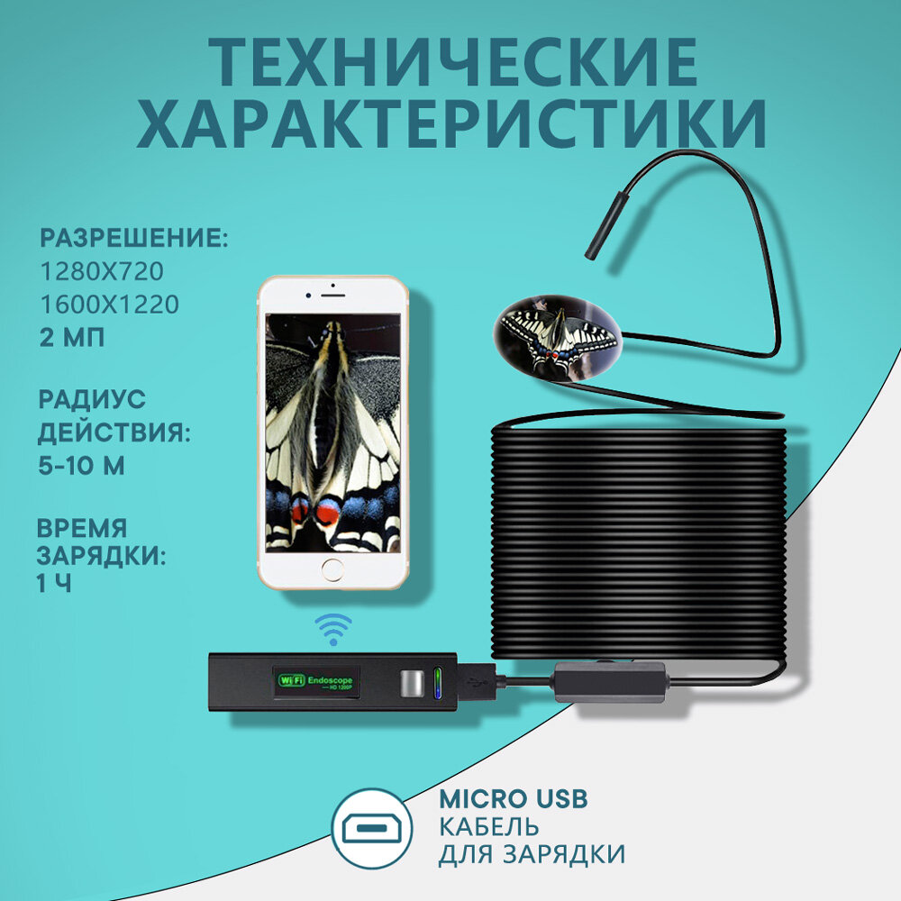 Эндоскоп для смартфона Андроид, Айфон и компьютера водонепроницаемый InnoZone 1200P 8мм Wi-Fi, гибкая камера, подсветка, длина 10м информация: