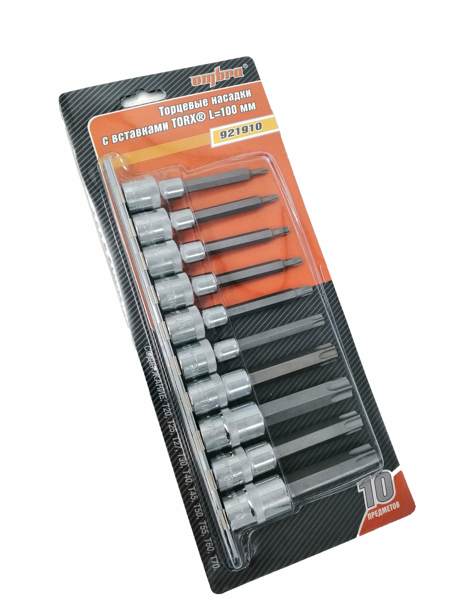 Набор насадок торцевых 1/2 DR с вставками-битами TORX® на держателе, T20-T70, 100 мм, 10 предметов Ombra 921910
