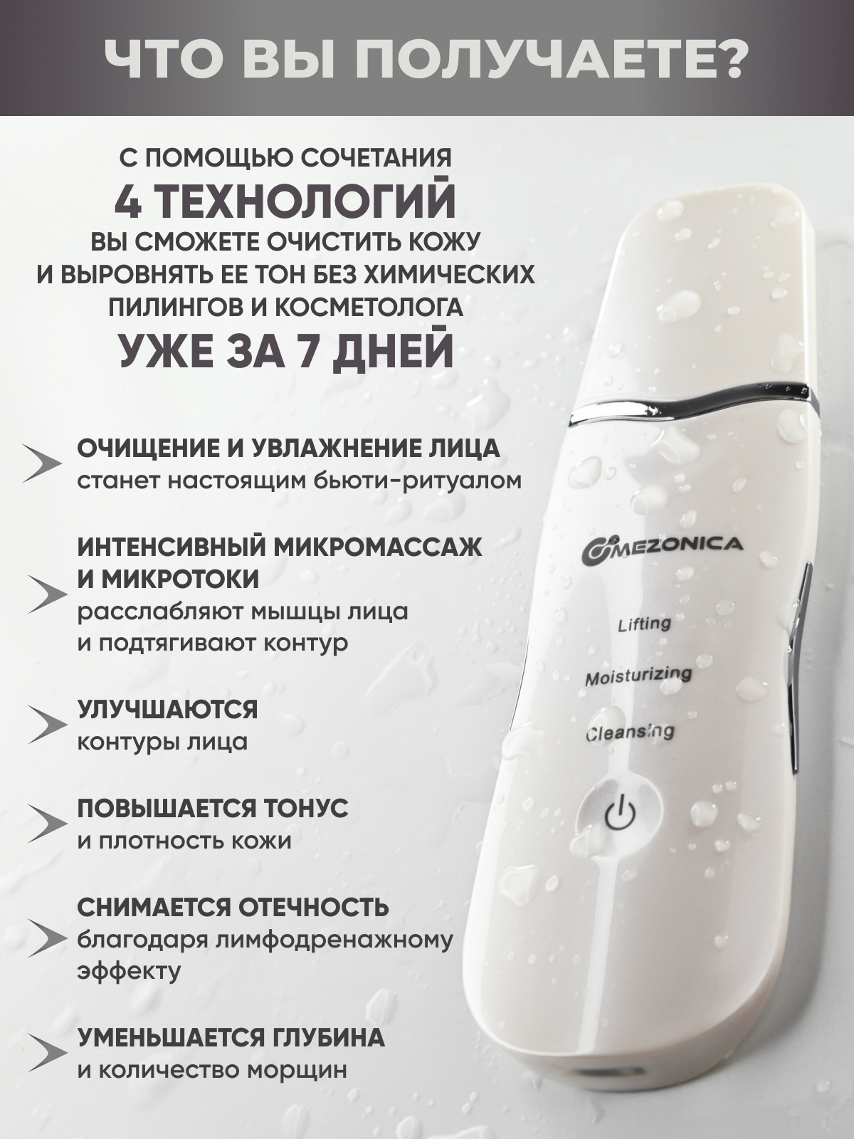 Mezonica Vibration gua sha pad with heat + LED therapy Микротоковый светодиодный массажер с подогревом и фототерапией для анти эйдж ухода за кожей лица